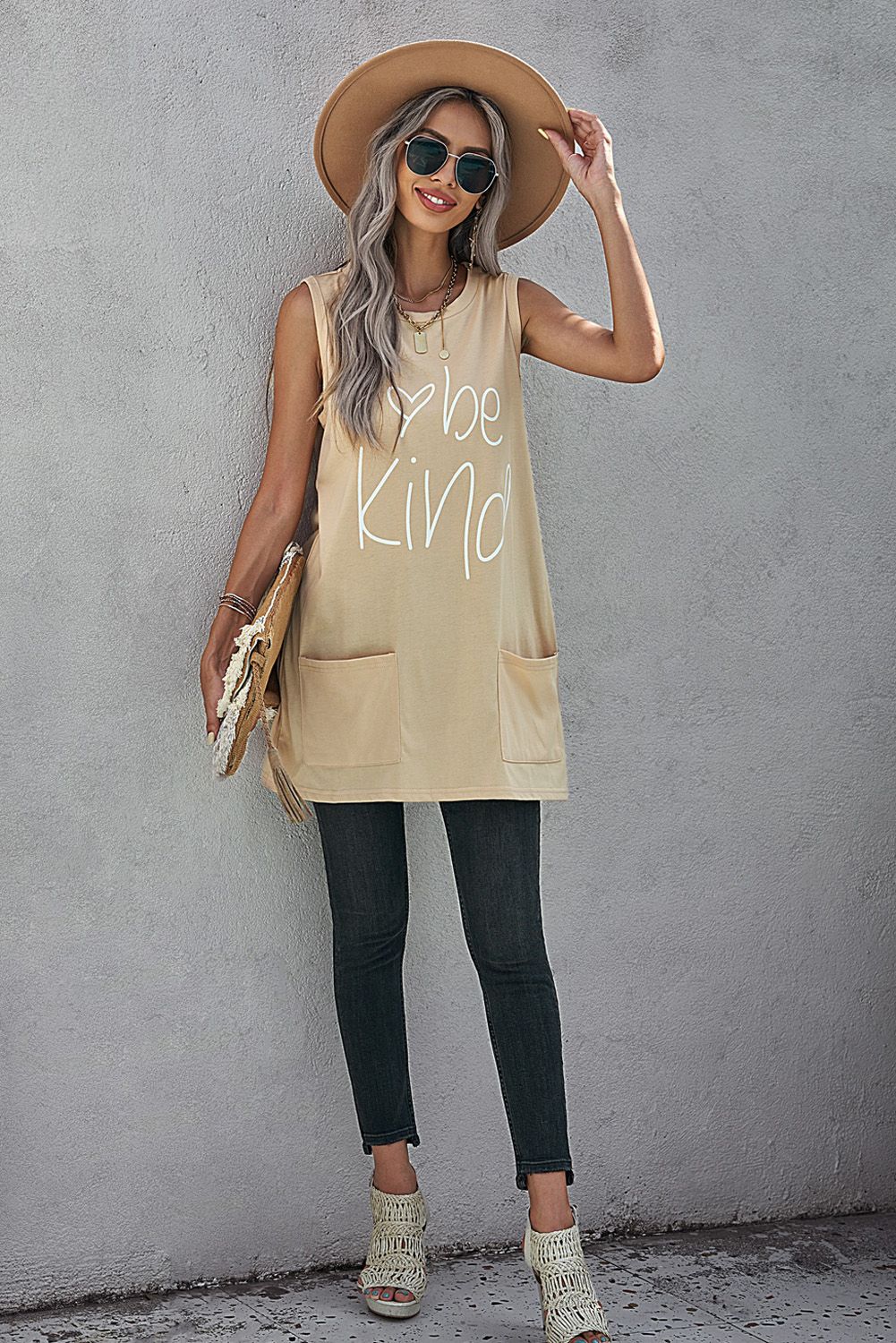 Solid color tank, chic letters graphic on the front, tunic length with sided pockets