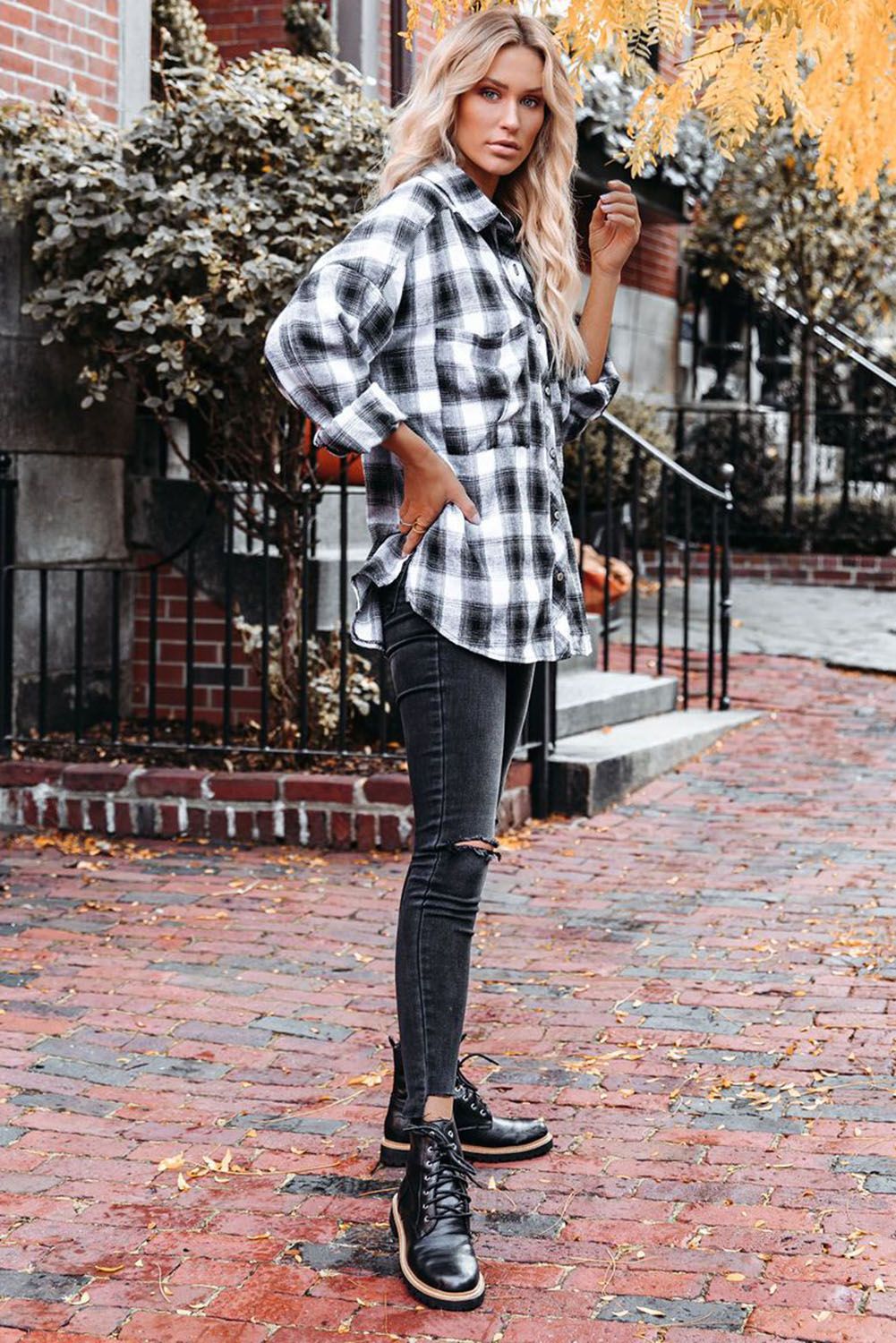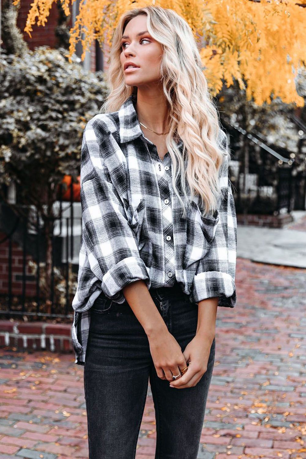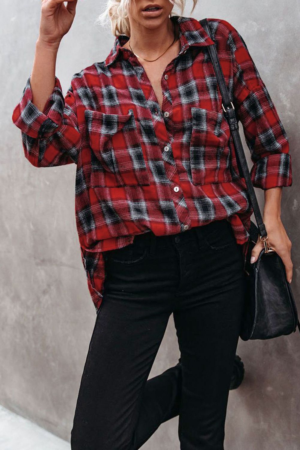We adore the black and red bold hues on the Cotton Blend Plaid Buttoned Shirt with Bust Pockets