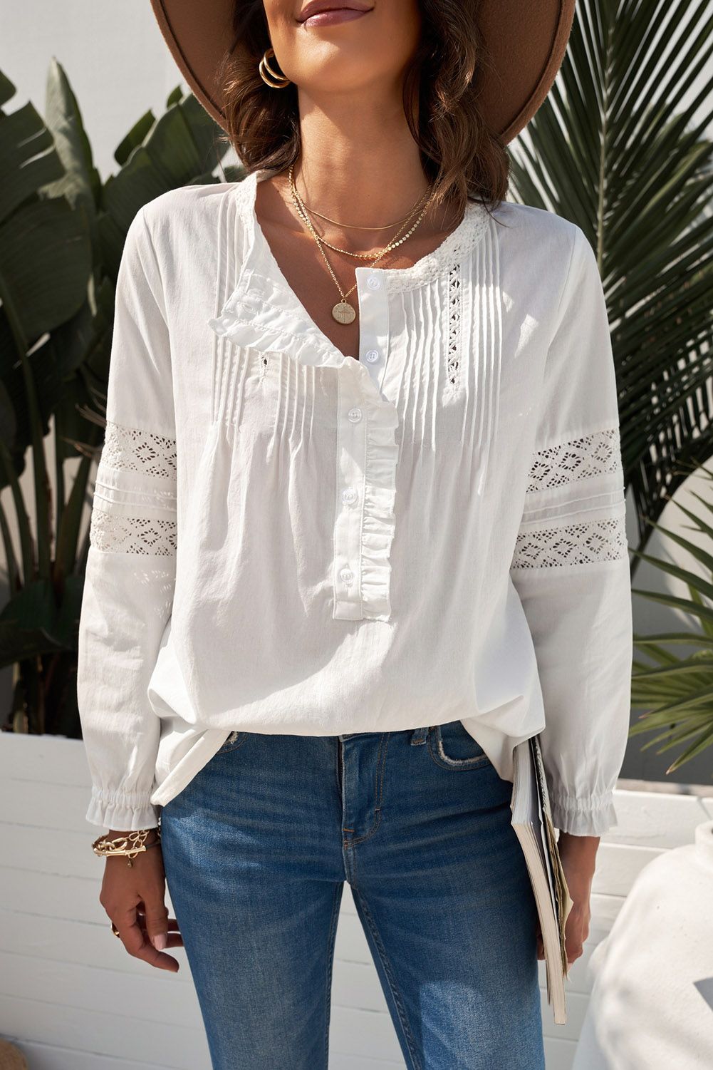 Lace crochet and ruffled details makes the shirt more elegant