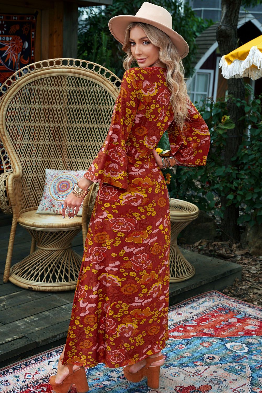 Floral Print Side Slit Buttons V Neck Maxi Dress