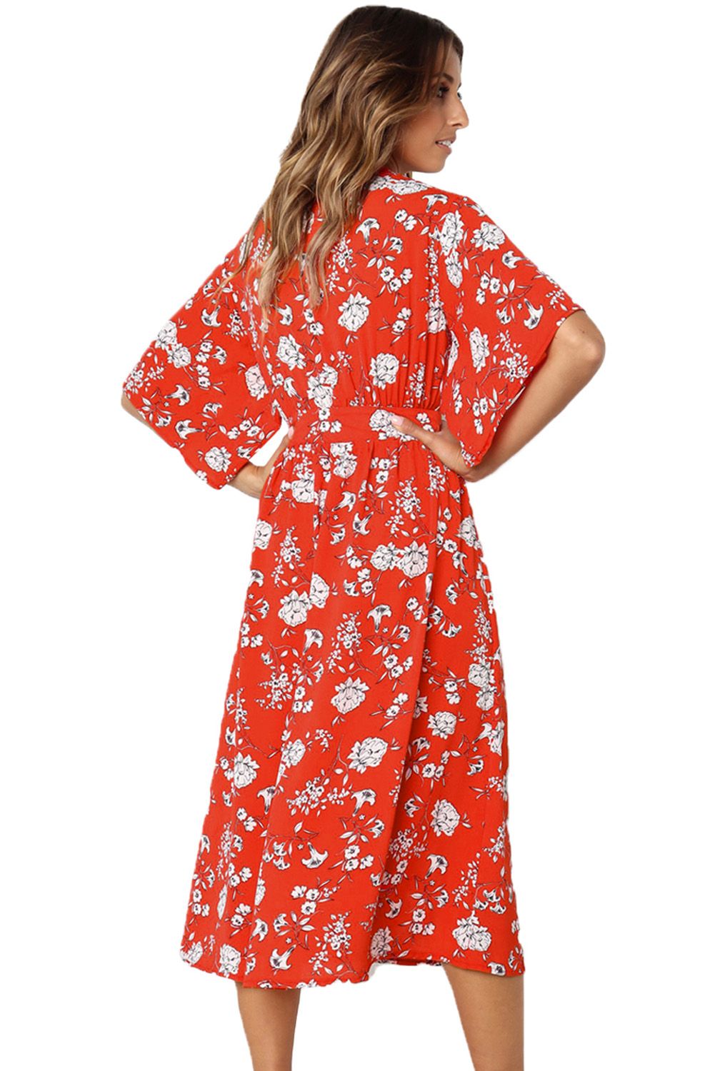 Red Boho Floral Knot Front Kimono Dress