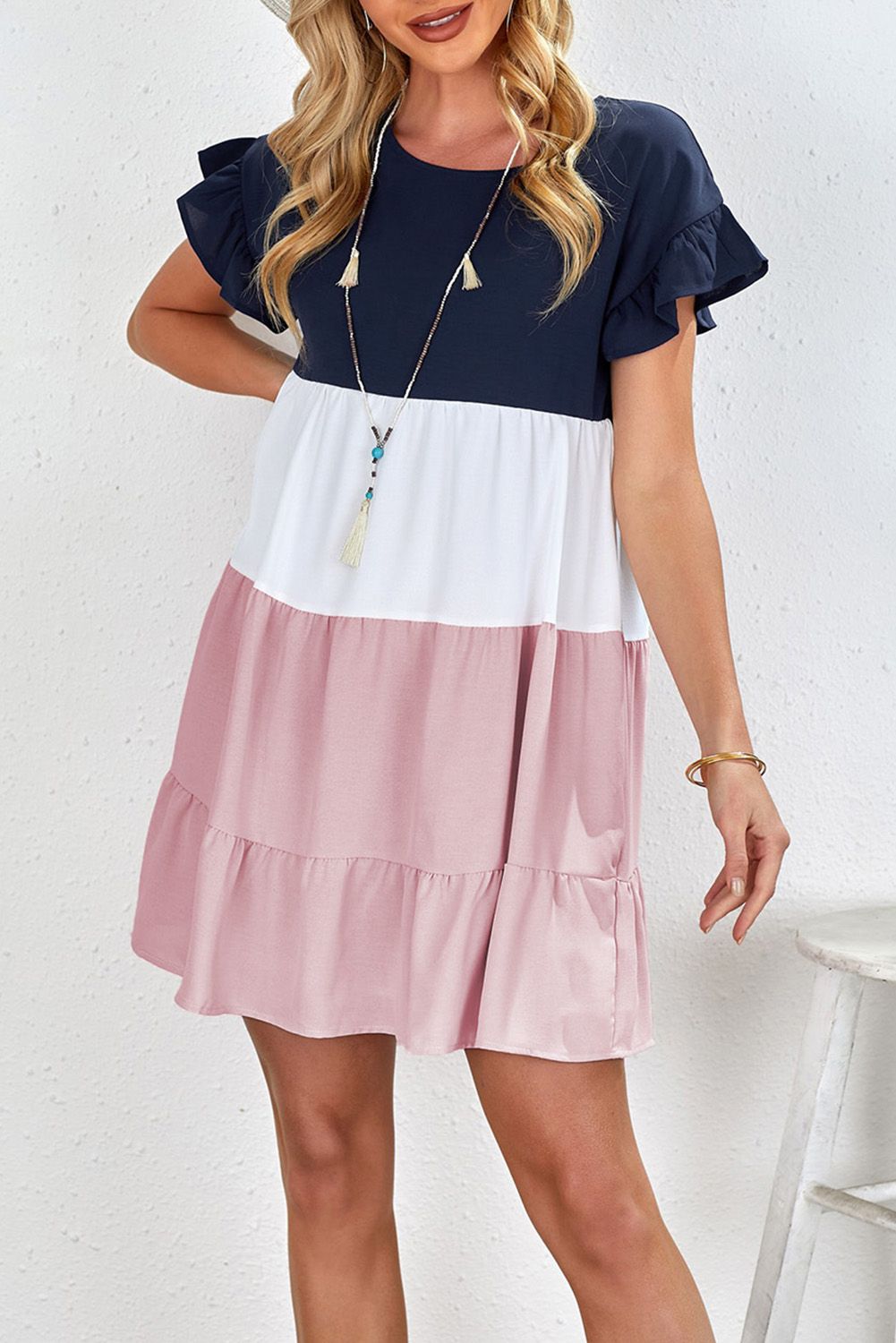Pink Ruffled Sleeve Tiered Color Block Mini Dress