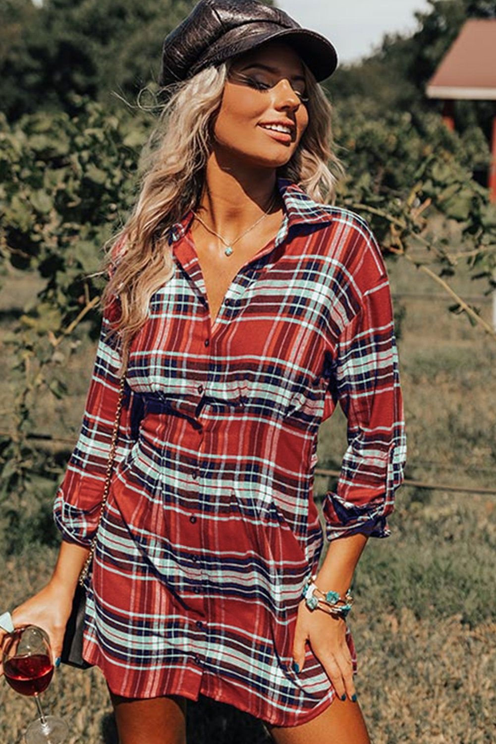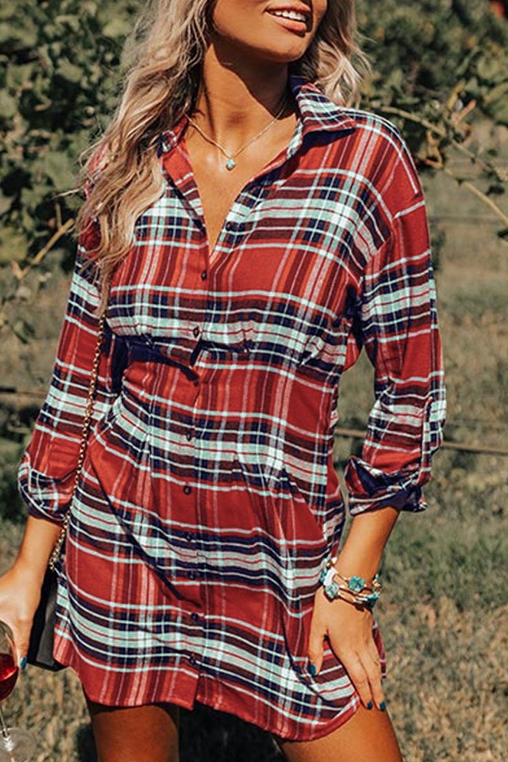 Red Plaid Print Buttoned Long Sleeve Shirt Dress