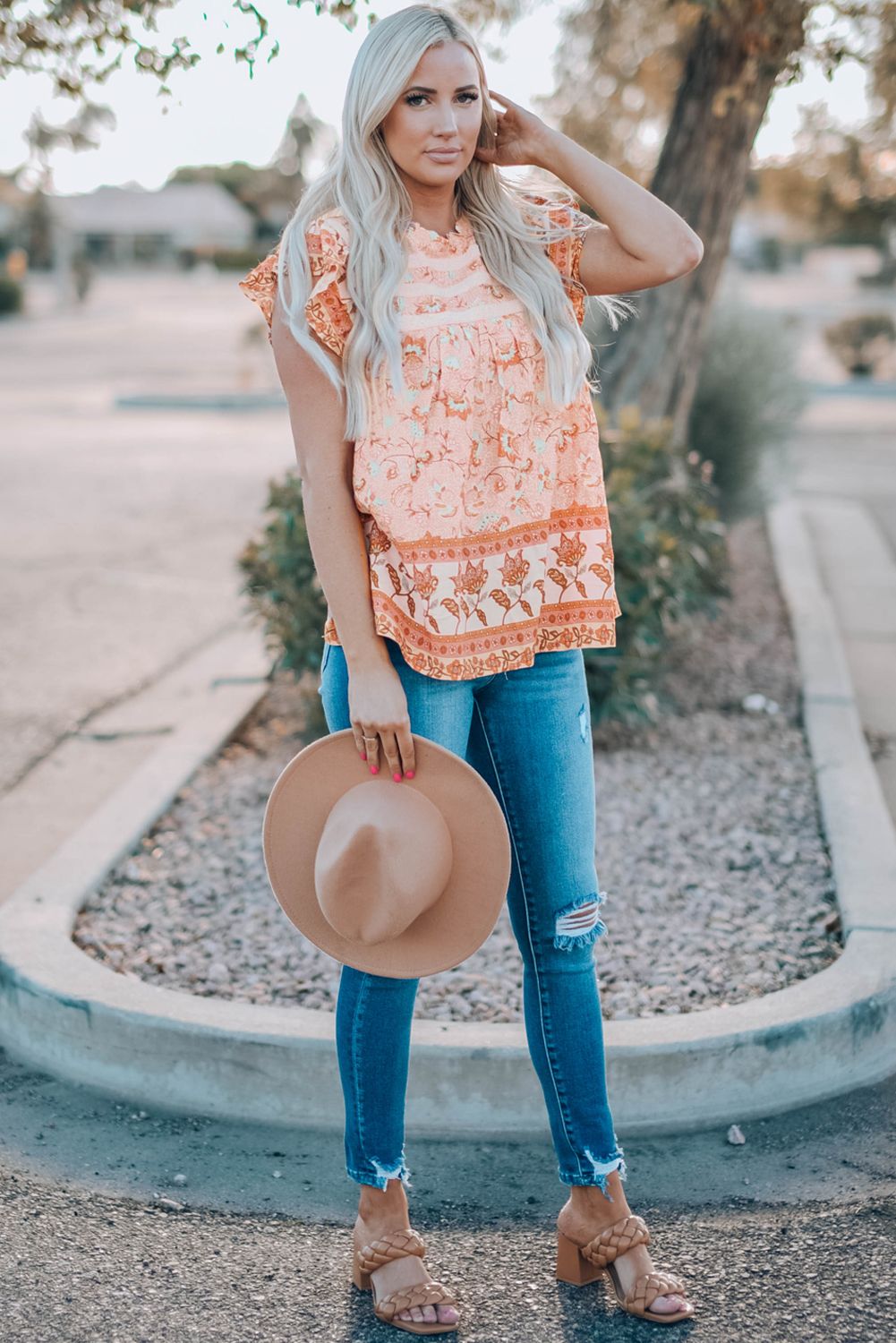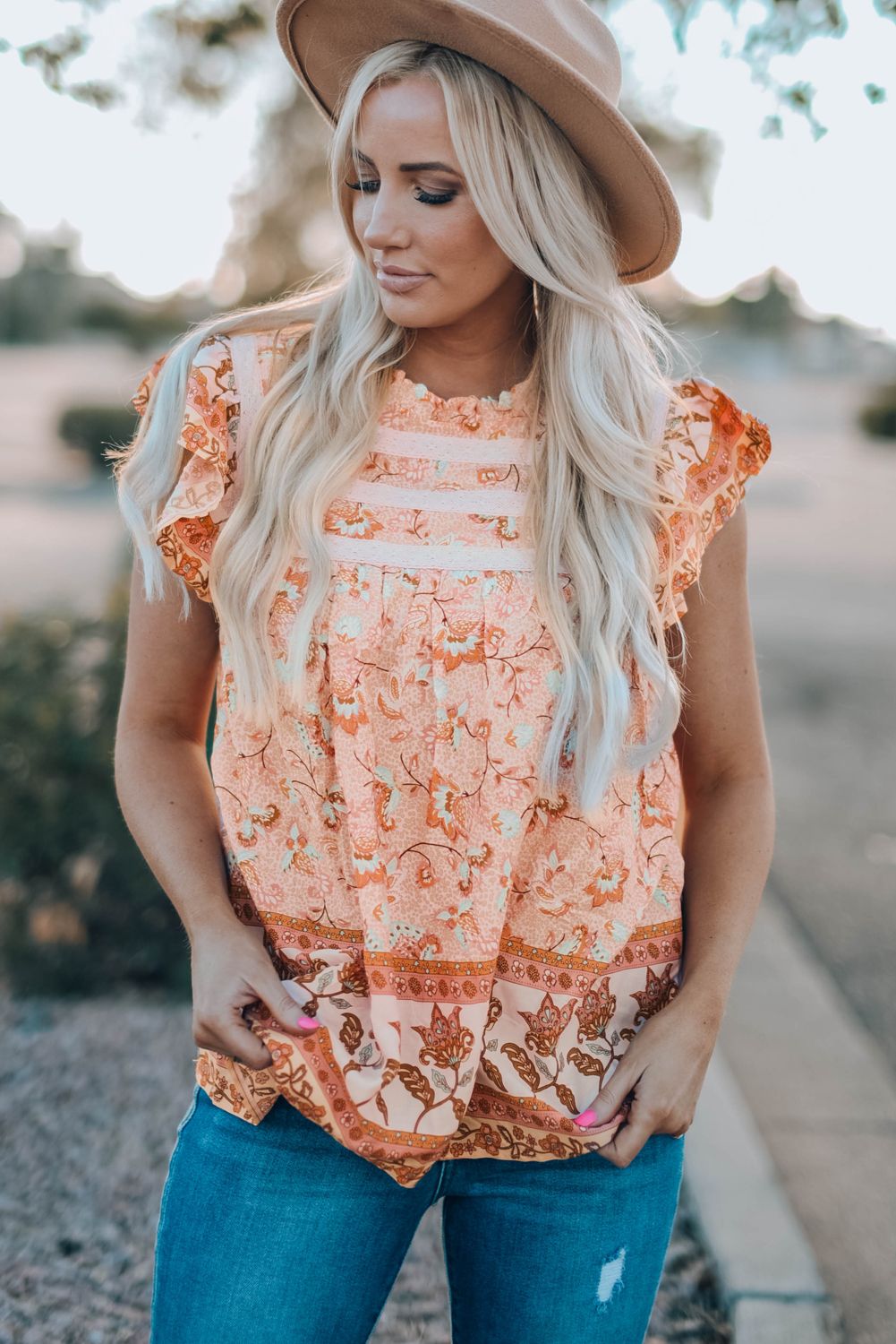 Orange Floral Print Ruffled Crew Neck Sleeveless Top