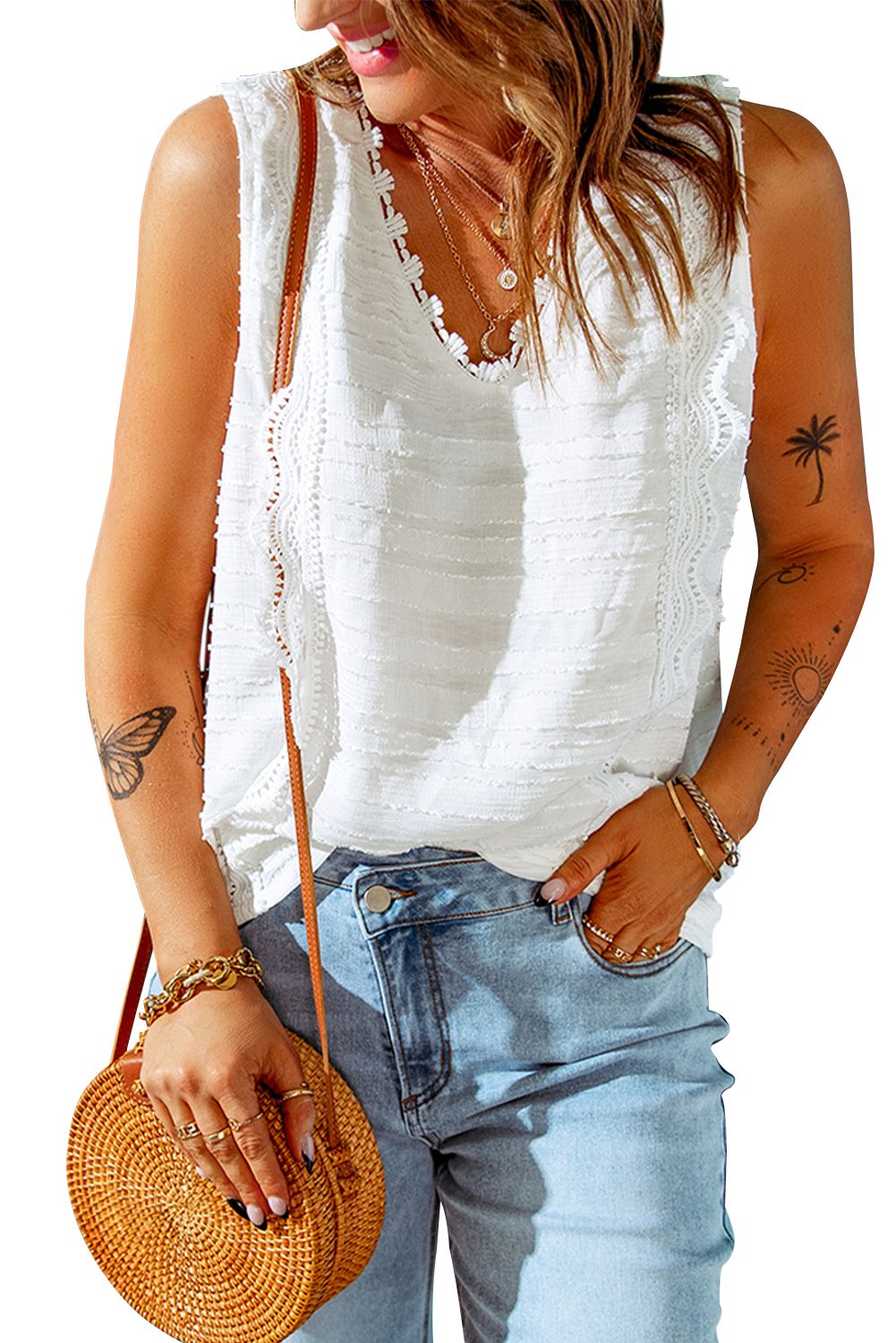 White Lace Crochet Keyhole Back V Neck Tank Top