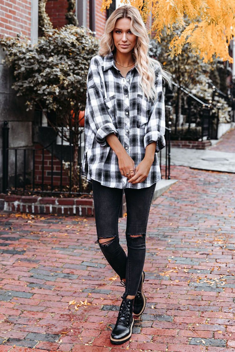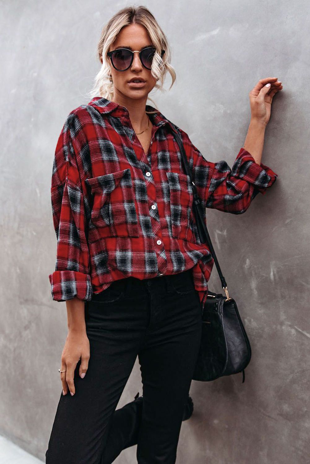 We adore the black and red bold hues on the Cotton Blend Plaid Buttoned Shirt with Bust Pockets