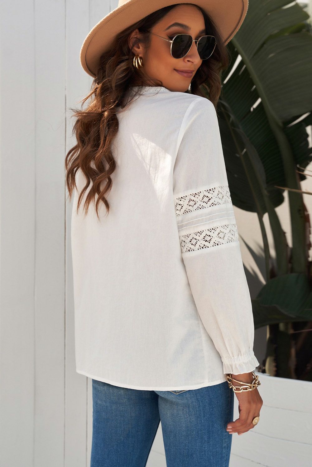 Lace crochet and ruffled details makes the shirt more elegant