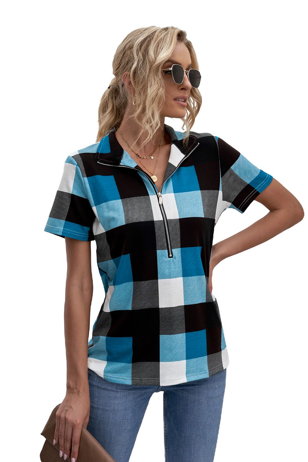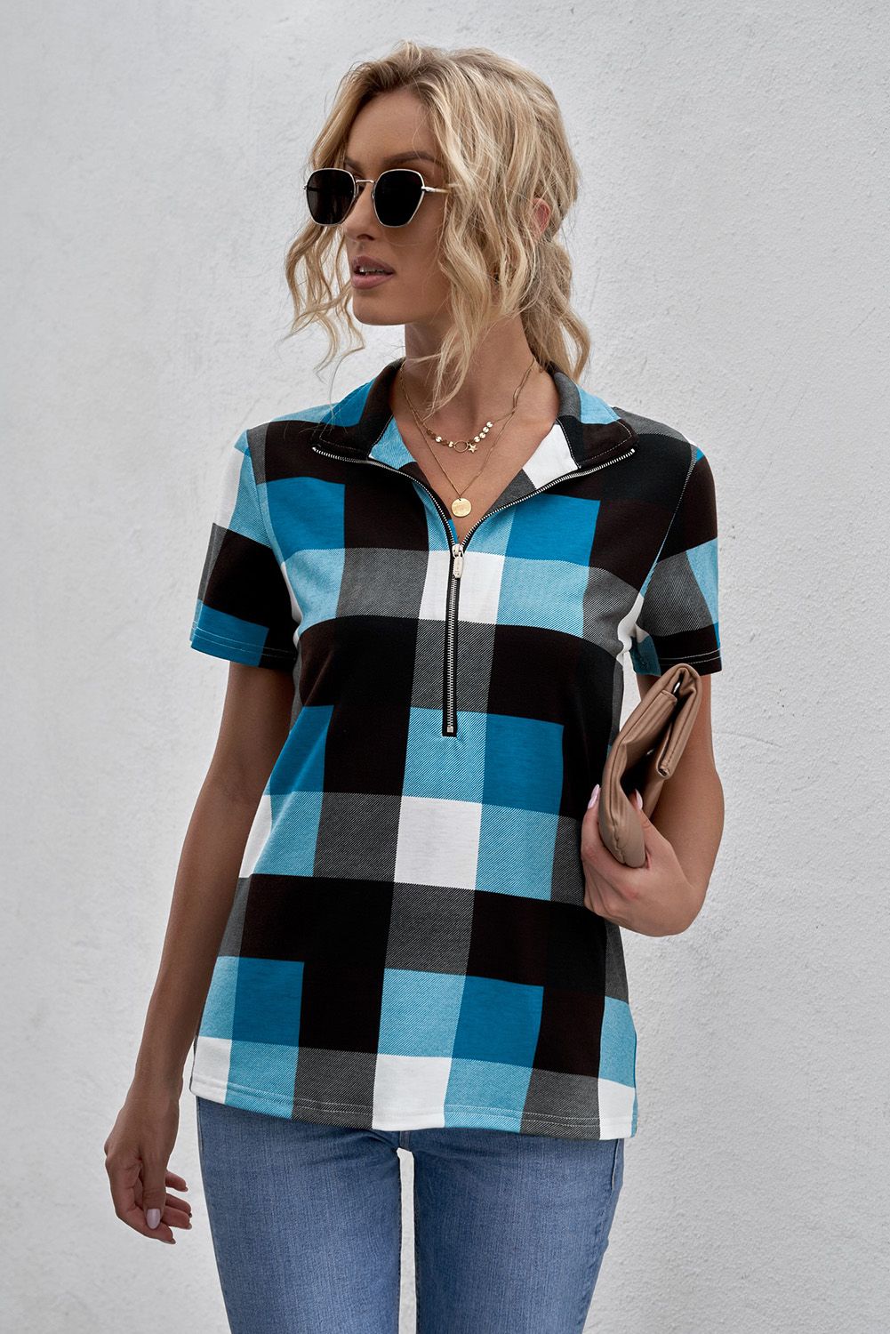 Blue Zipped V Neck Plaid Short Sleeve Blouse