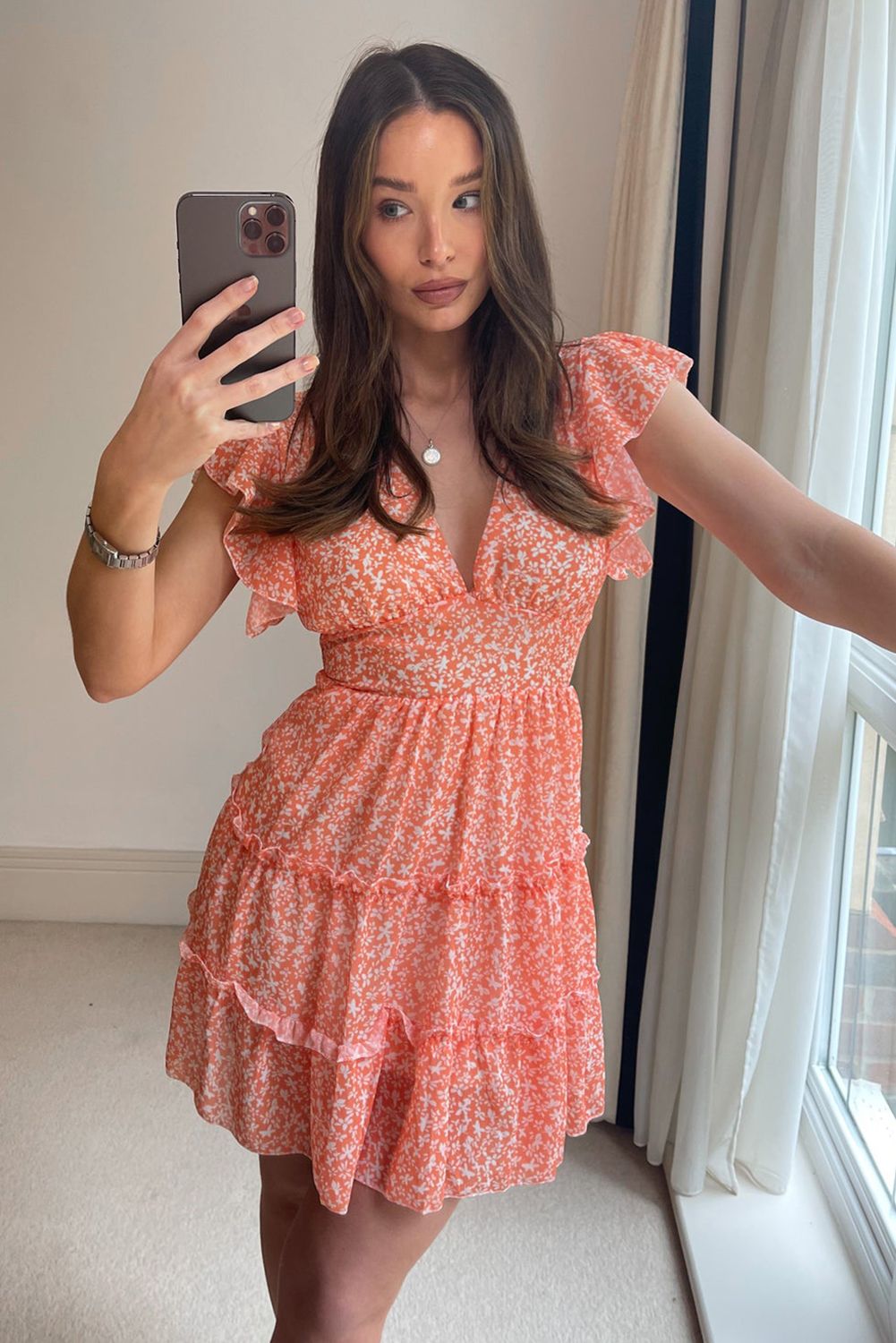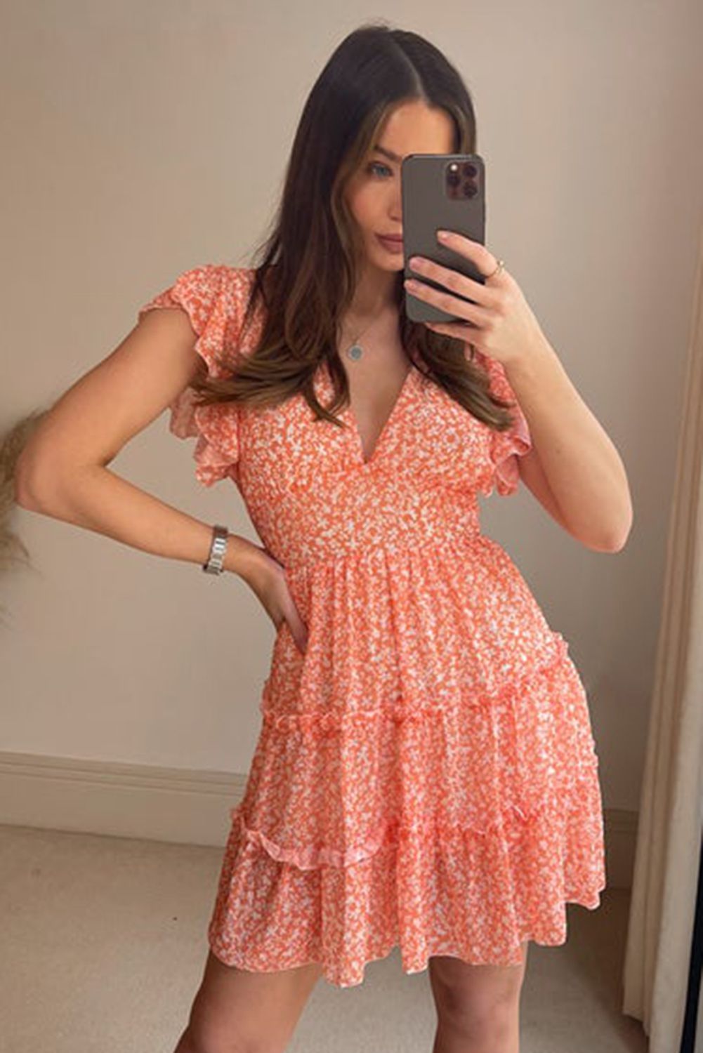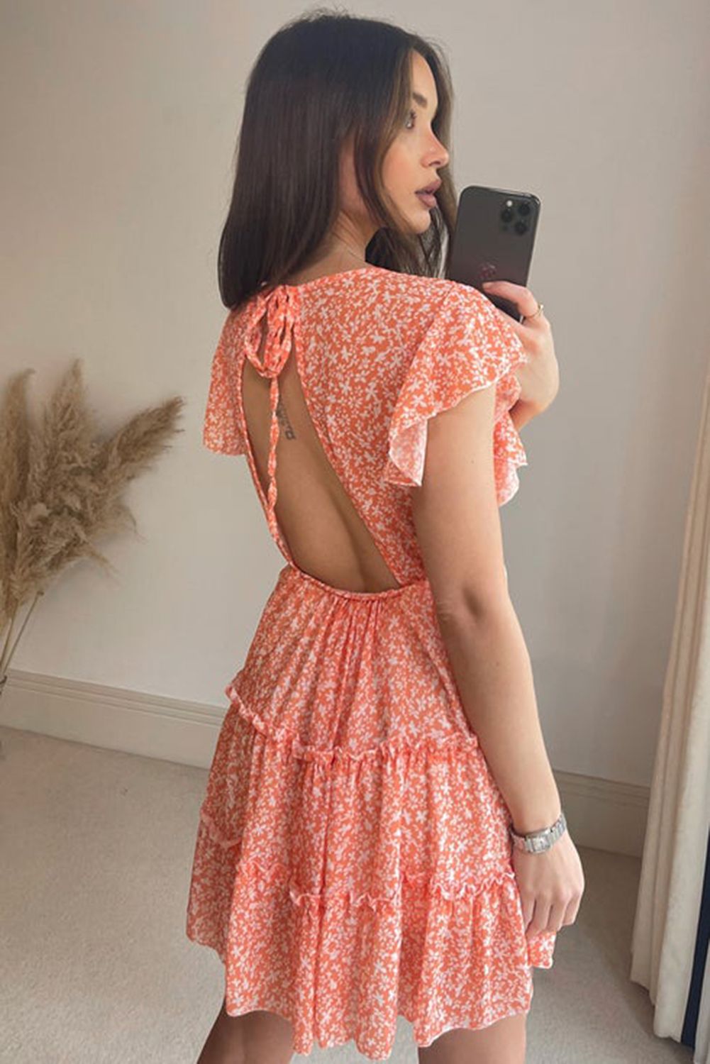 • Ditsy floralprint and rufflesmake this shortdress elegant and fashionable