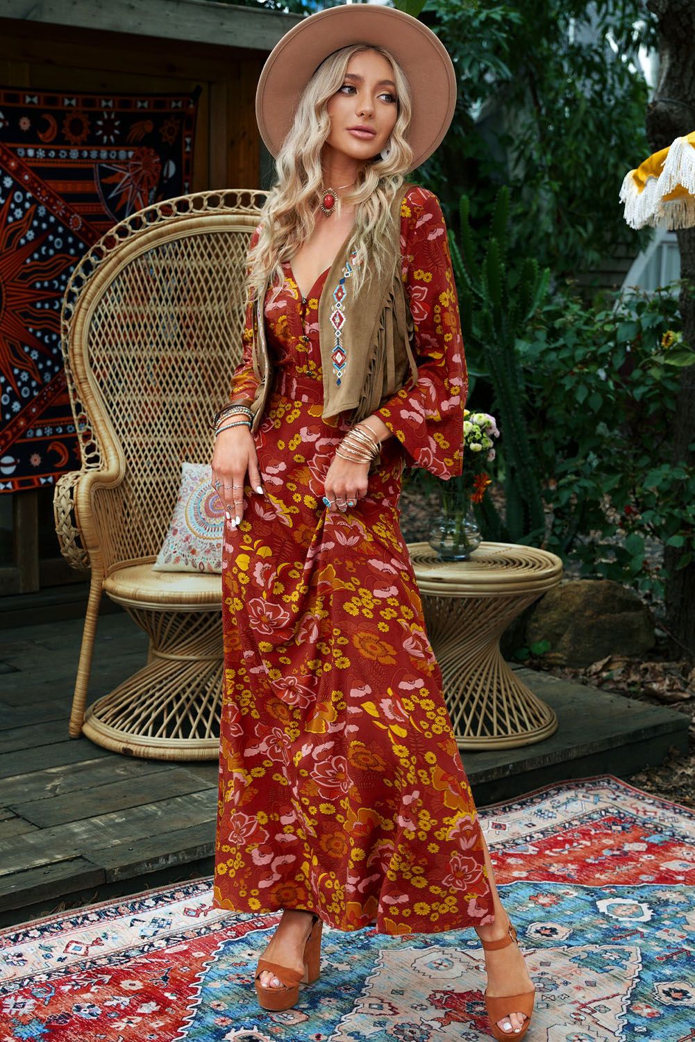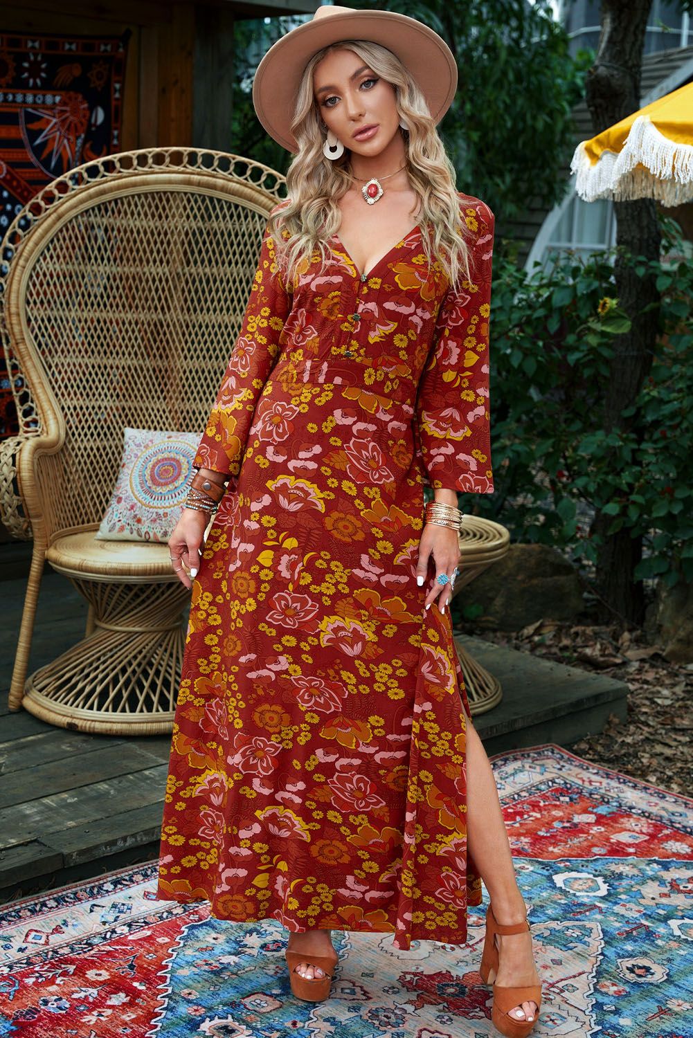 Floral Print Side Slit Buttons V Neck Maxi Dress