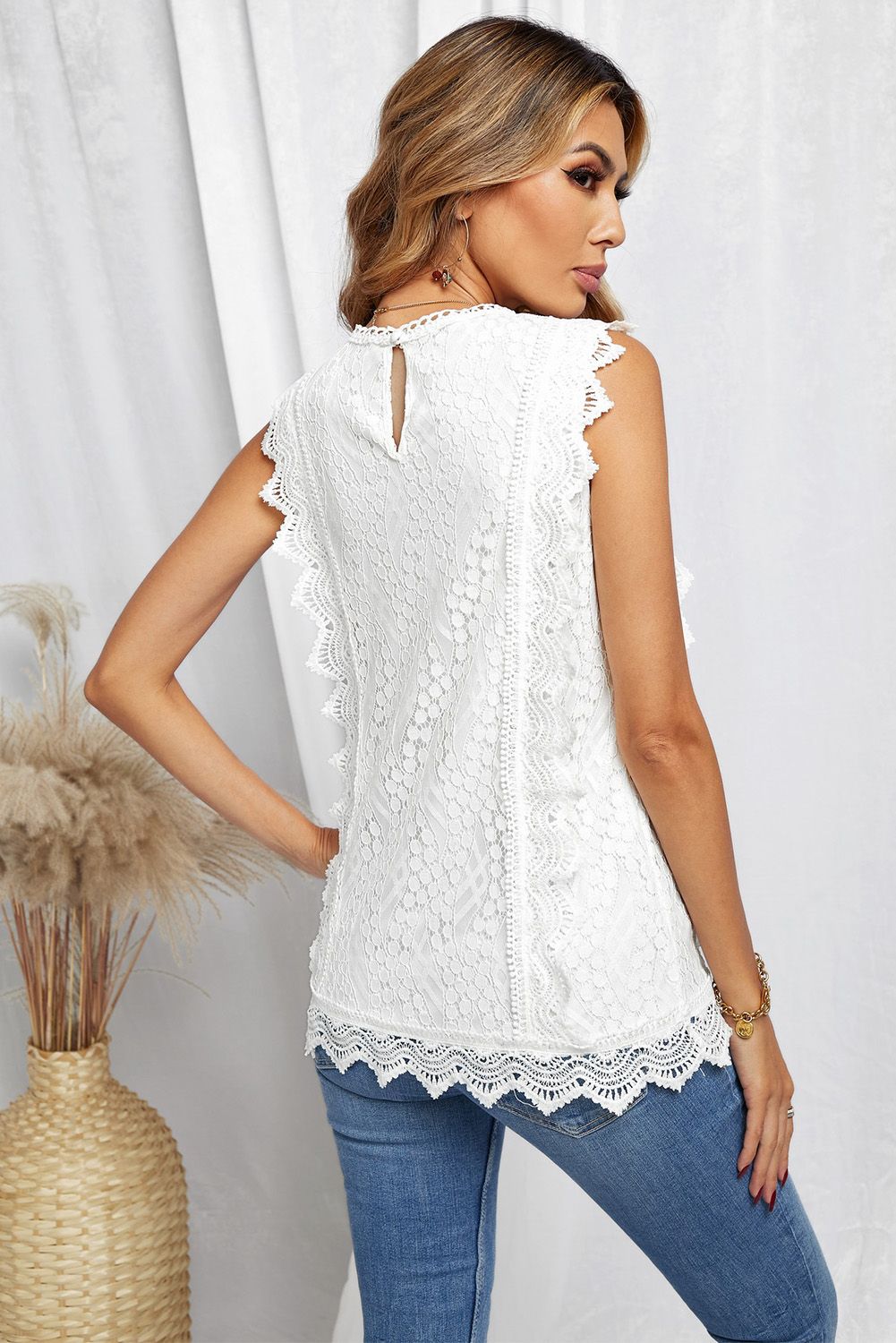 White Crew Neck Scalloped Trim Lace Tank