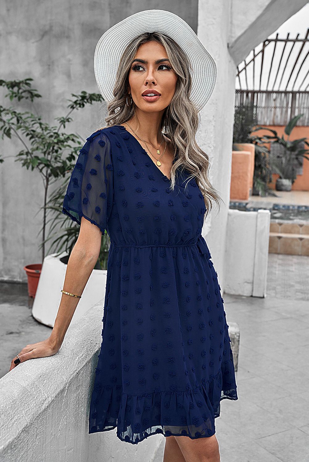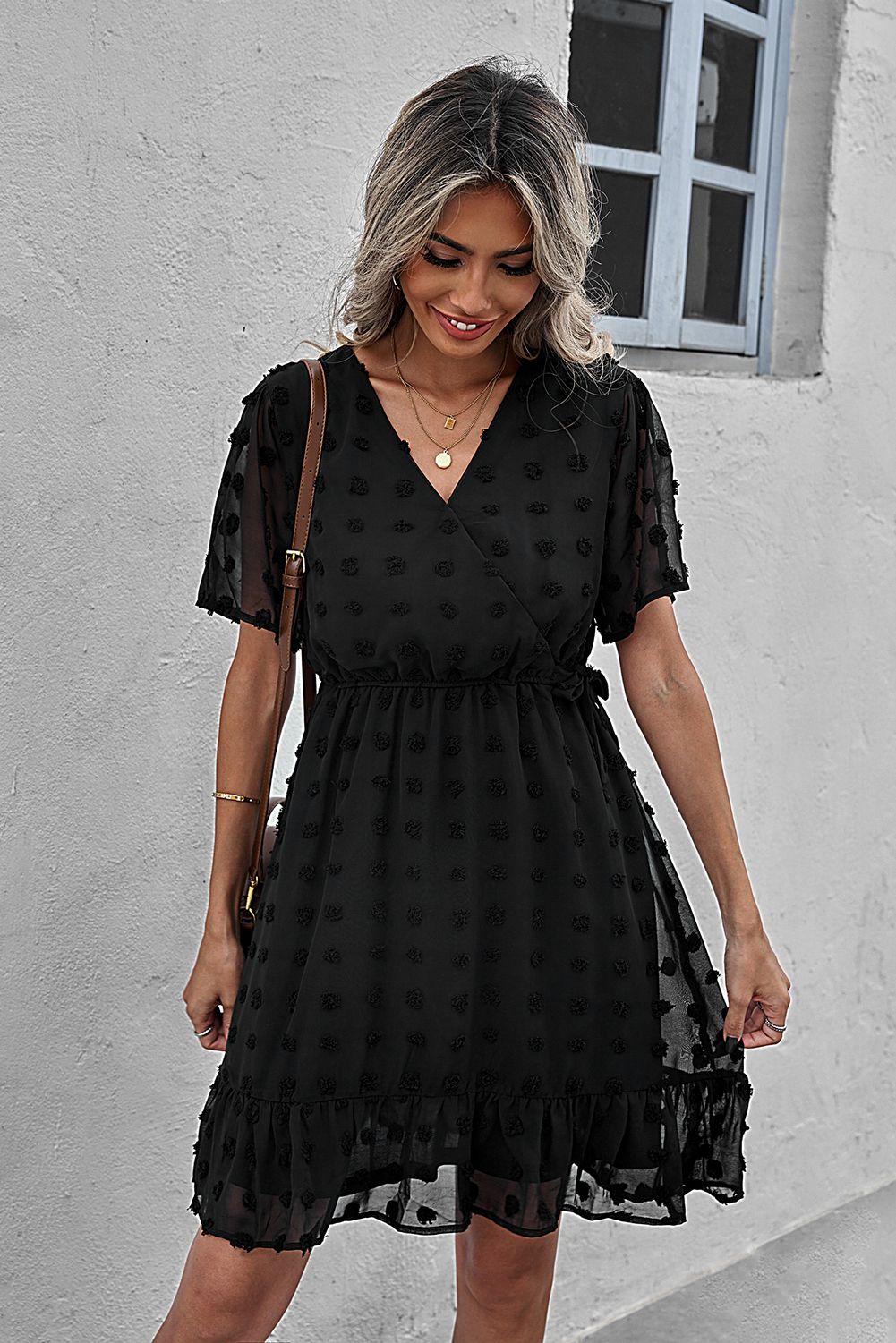 The mini dress with wrap v neck, short sleeve, swiss dot, lace-up and loose hem design
