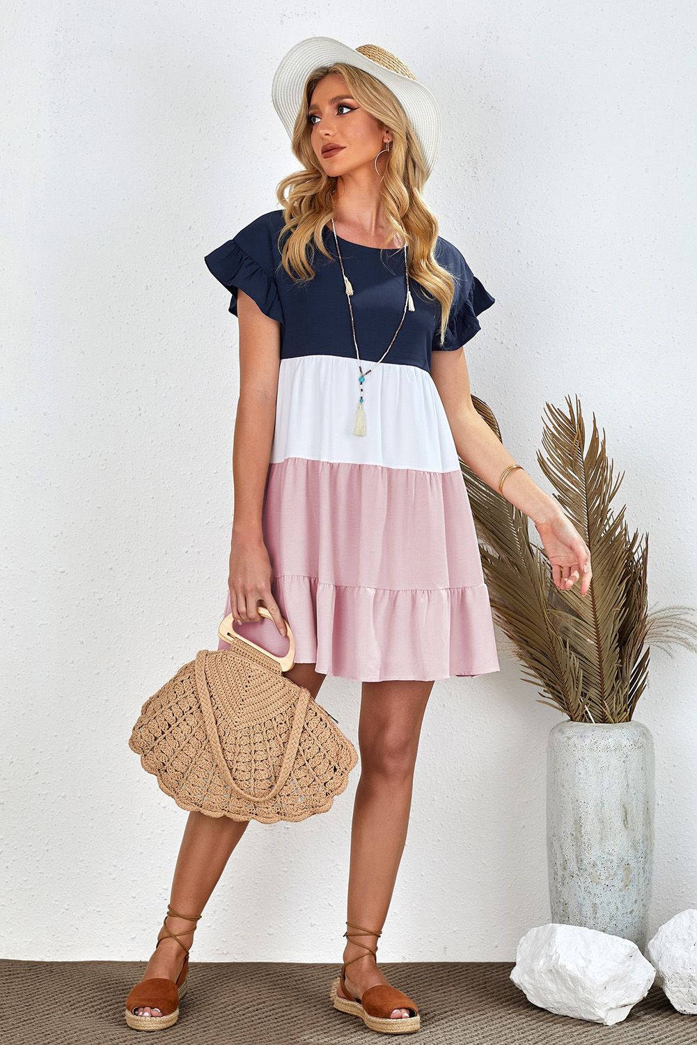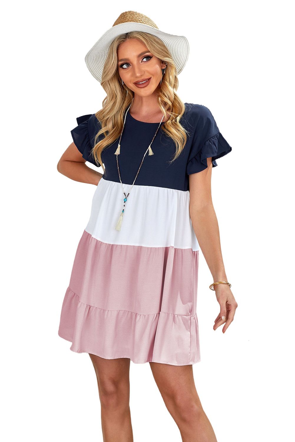 Pink Ruffled Sleeve Tiered Color Block Mini Dress