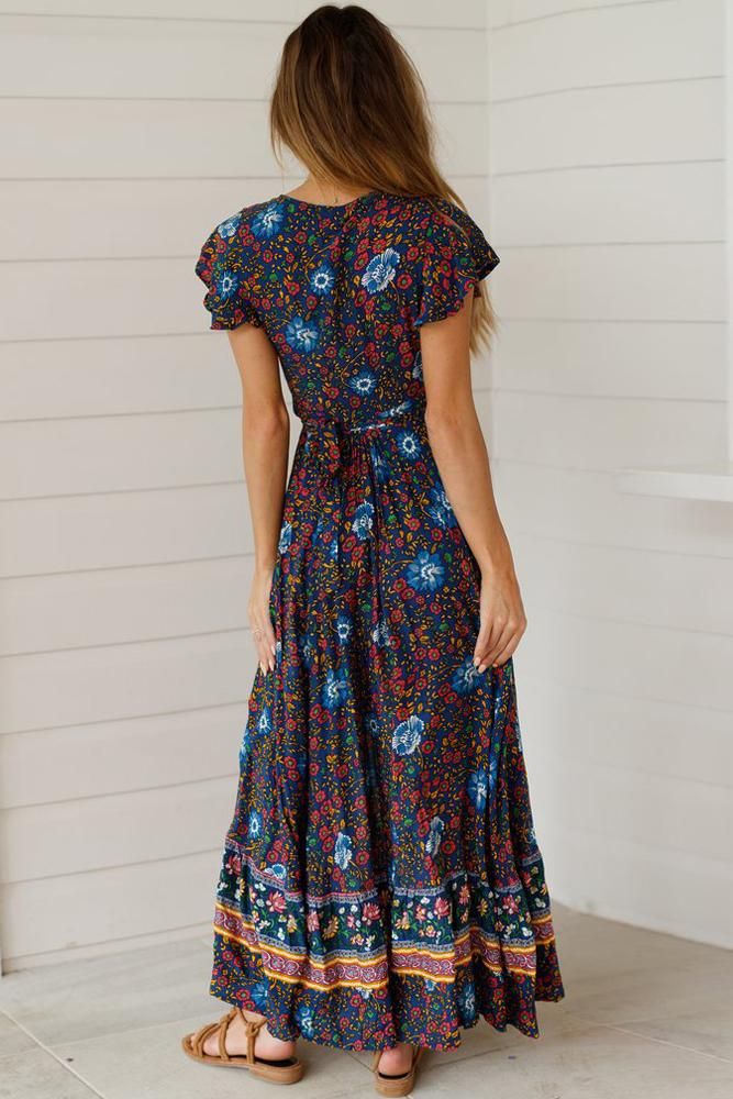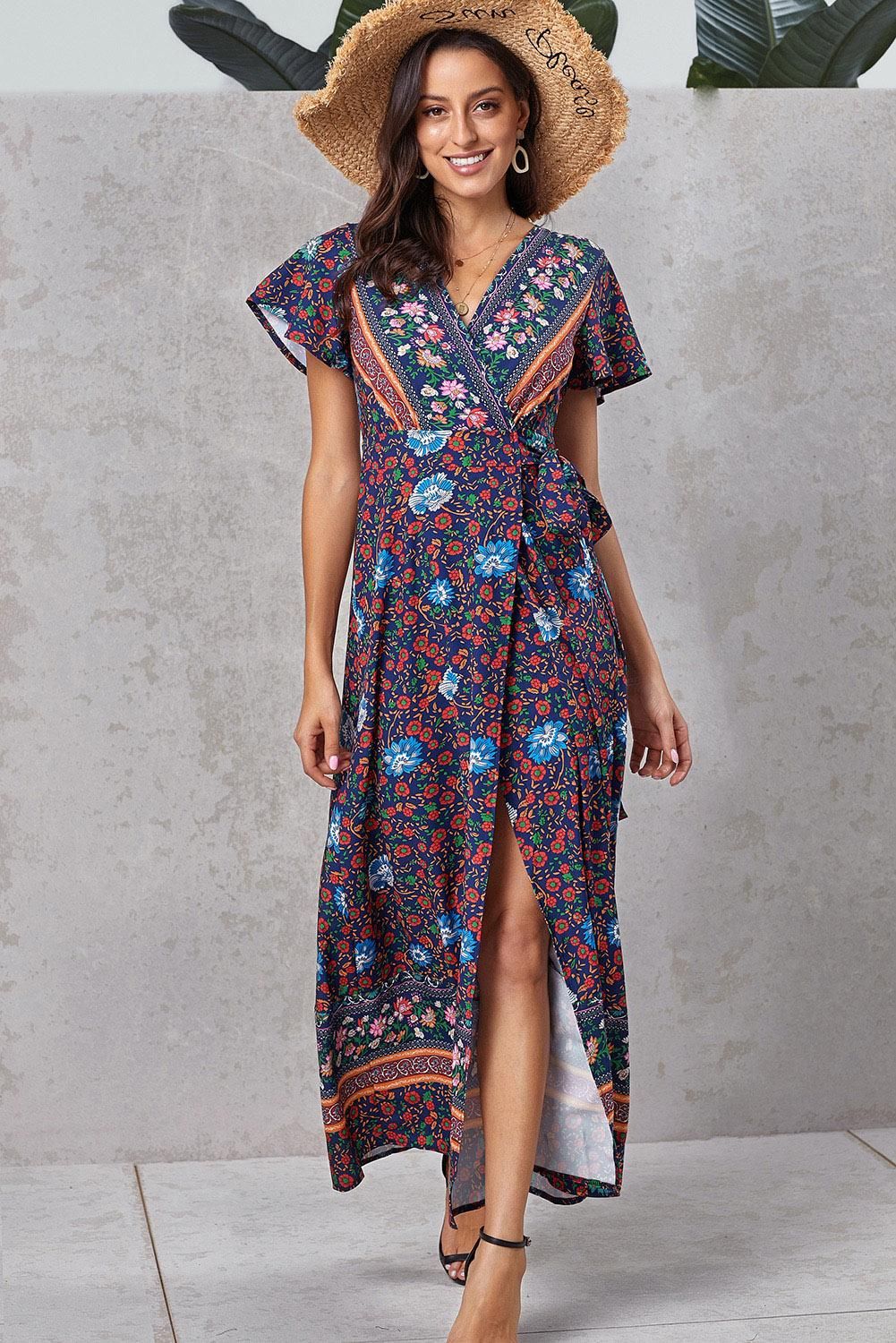 Multicolor V-Neck Beach Resort Printed Dress