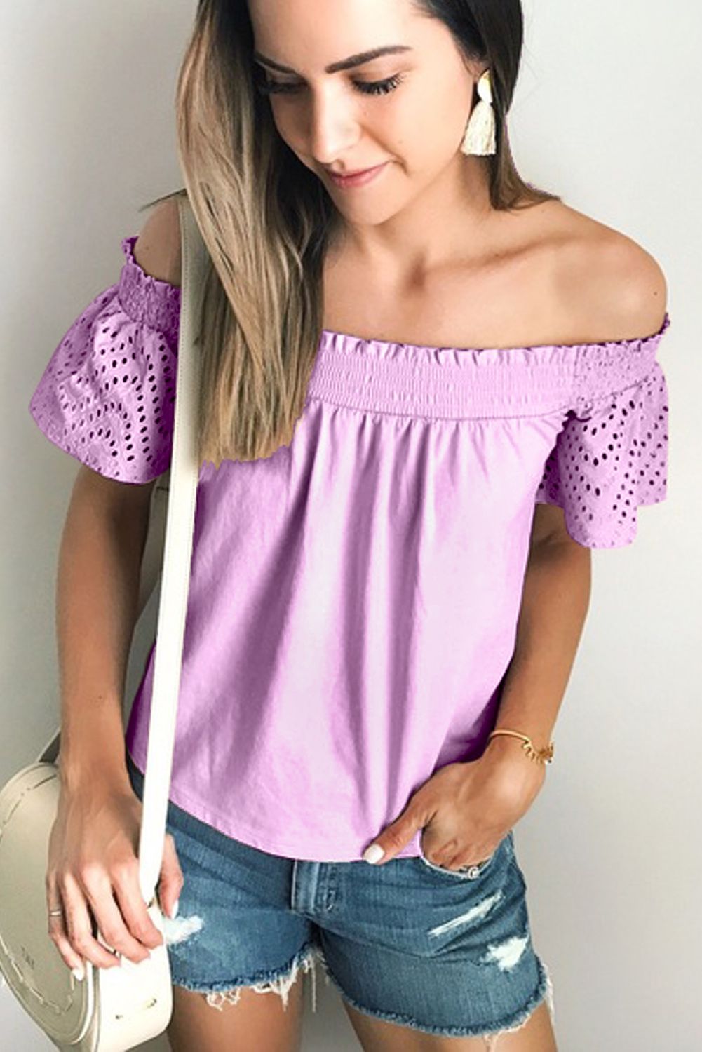 Pink Solid Shirring Off Shoulder Hollow out Top